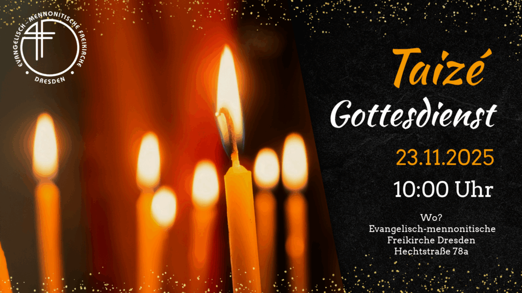 Aktuelle Veranstaltungen 2025 02.11.10 Uhr Gottesdienstfeier 06.11.19.30 Uhr Gemeindegespräch 09.11.ACHTUNG 16 Uhr Nachmittagsgottesdienstfeier mit Abendmahl 16.11.10 Uhr Gottesdienstfeier 23.11.10 Uhr Taizé Gottesdienstfeier 12-15 Uhr Café zum Ewigkeitssonntag 29.11.9-15 Uhr Seminar Glaube und Medien mit Anmeldung! 30.11.10 Uhr Gottesdienstfeier Ausblick 24.12.15 Uhr Heiligabendgottesdienst 16.30 Uhr Heiligabendgottesdienst jeweils mit Anmeldung! 10.01.2026Gemeindehausputz 11.-18.01.2026Allianzgebetswoche